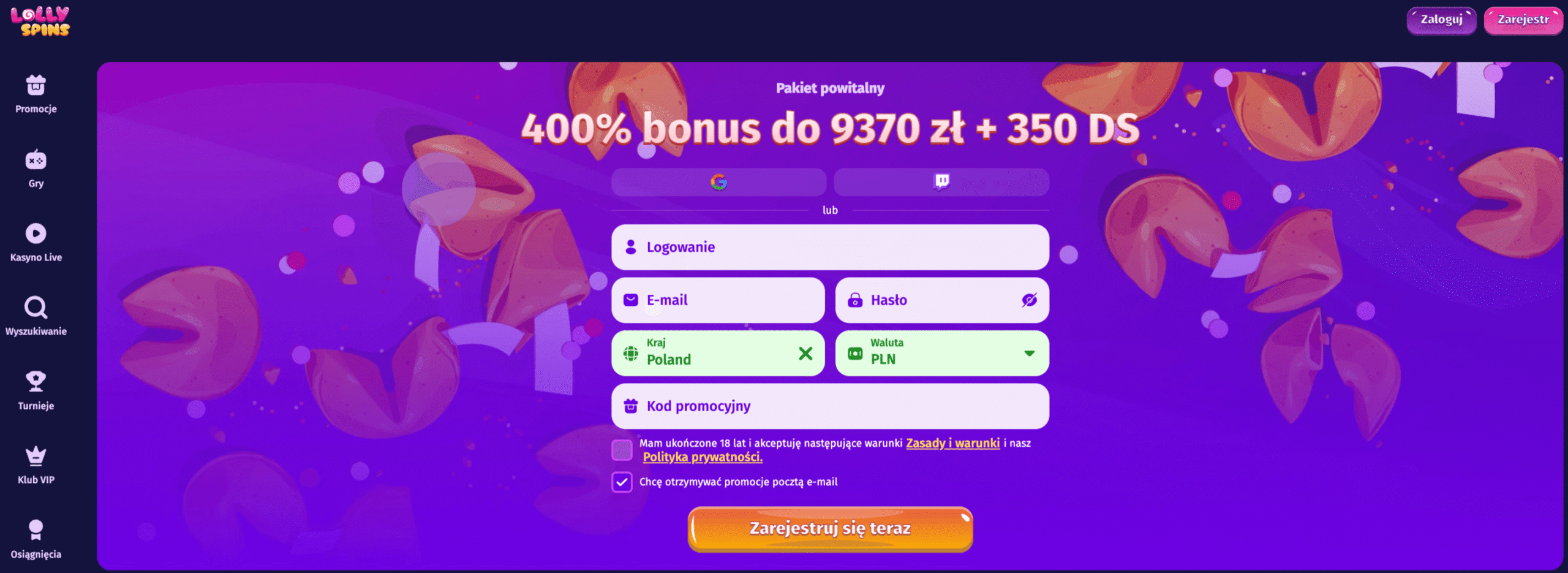 - Wejdź na stronę Lolly Spins i kliknij na „Zarejestruj się”