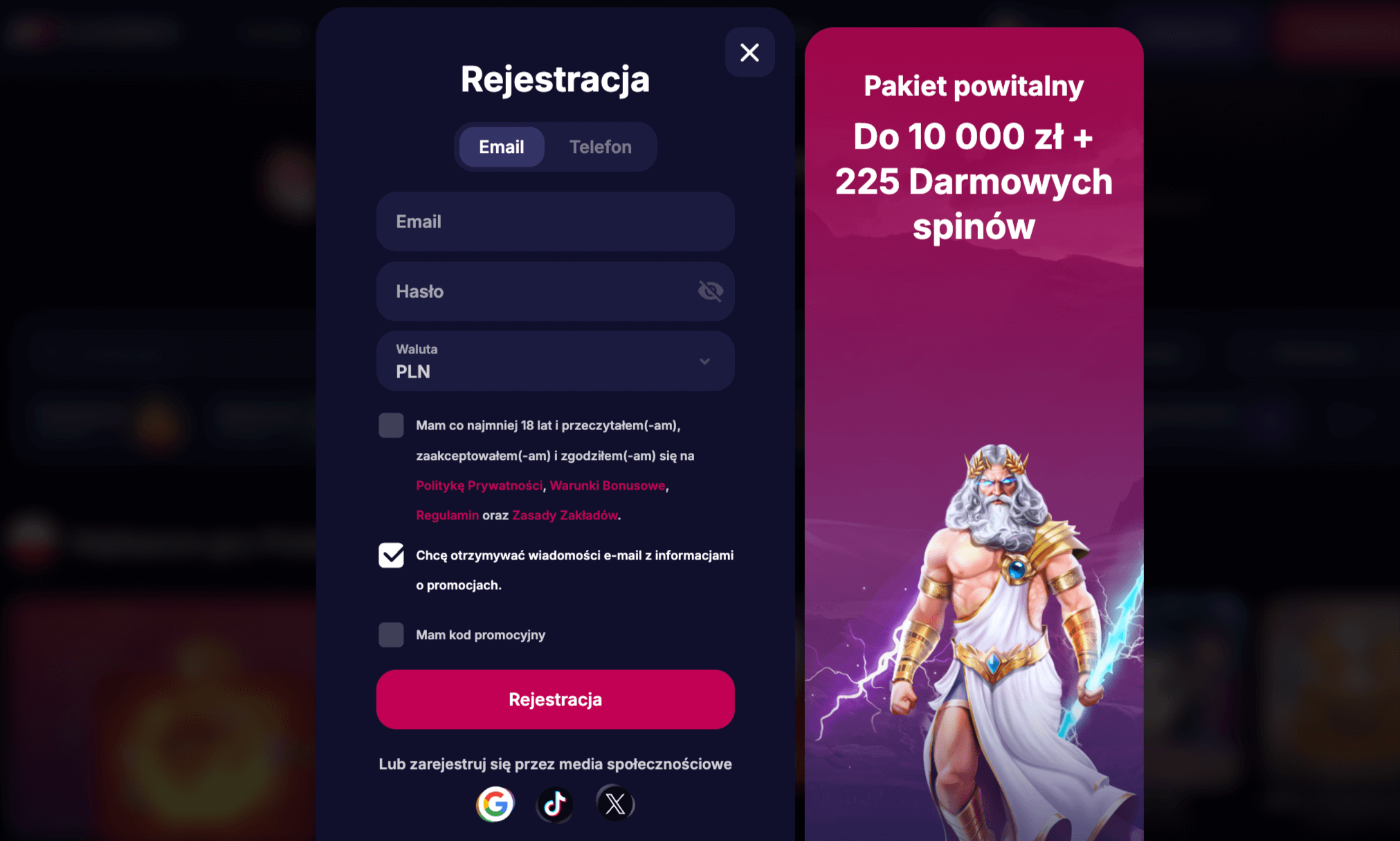 Rejestracja jest możliwa także z wykorzystaniem istniejącego konta Gmail, Facebook, Tik Tok lub X.